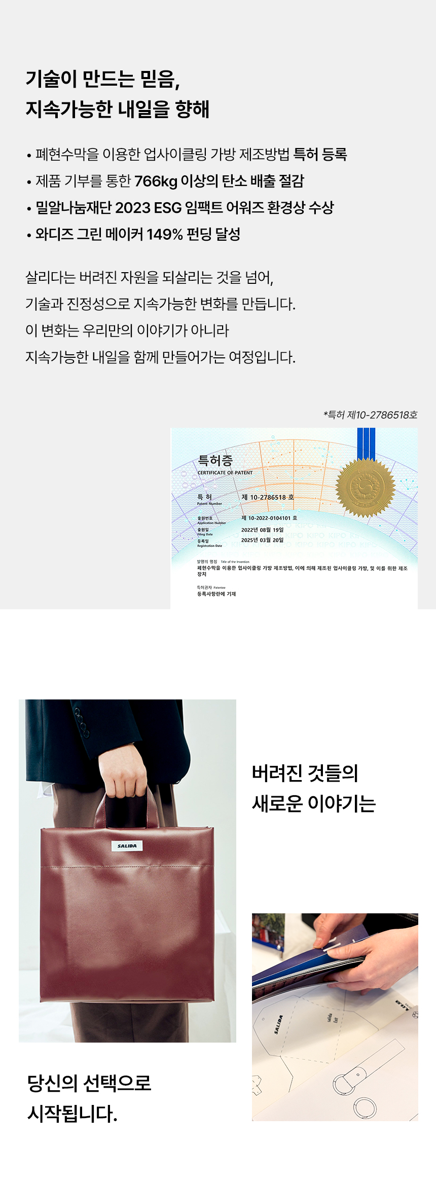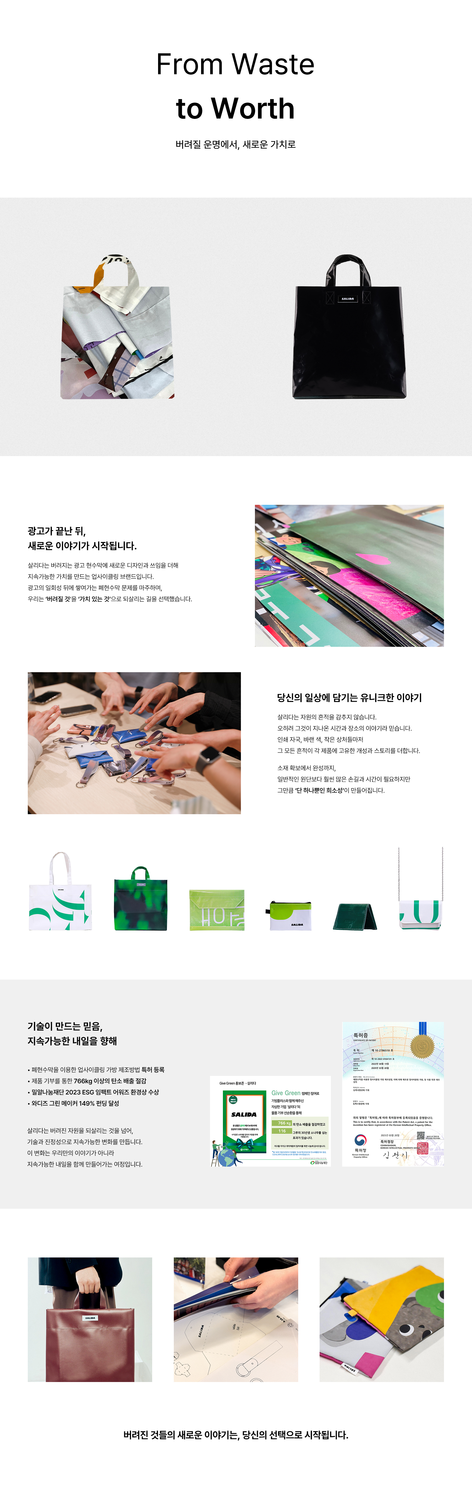살리다의 폐현수막 업사이클링 가방 제조방법이 2025년 특허로 공식 인정받았습니다.